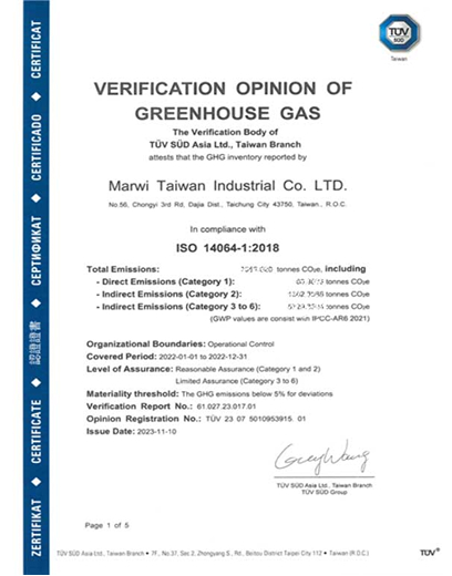 Marwi Taiwan established 2022 as its base year for the ISO 14064-1 organizational greenhouse gas inventory and successfully completed verification by TÜV SÜD in November 2023.